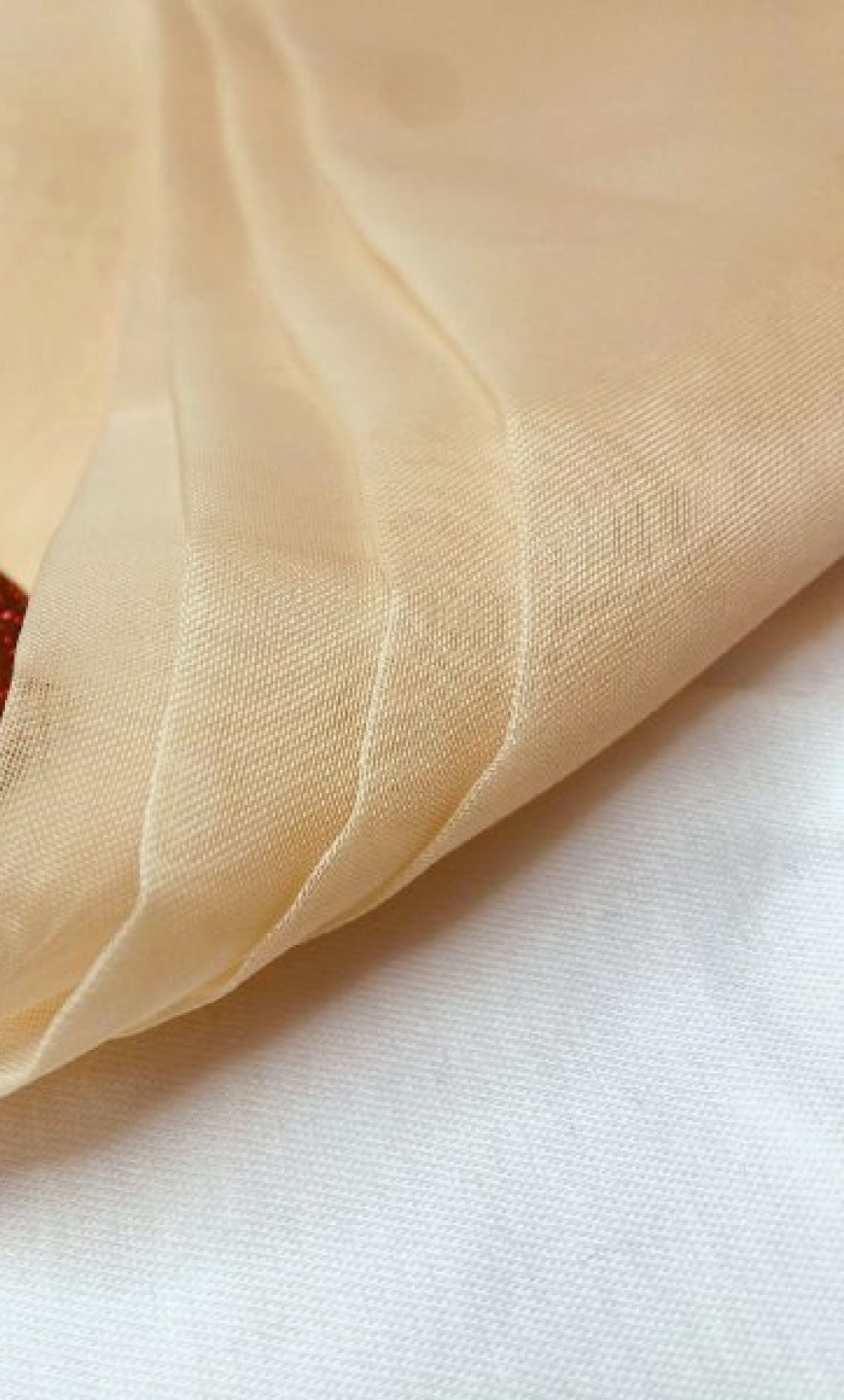 Вуаль — синтетическая ткань, состоящая из 100% полиэстера. Вуаль представляет собой тонкую полупрозрачную материю полотняного переплетения с мягким матовым блеском. Она полупрозрачная, легкая, полотно практически не мнется и не требует сложного ухода. Из вуали также можно шить легкие предметы одежды или использовать в декоре и создания мелких аксессуаров. Состав позволяет применять ее в сублимационной печати. Применяется для драпировки, а также при пошиве штор.
